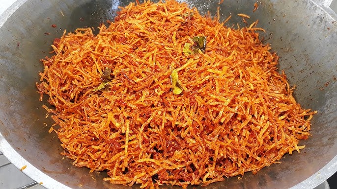 Kentang ini dipotong super tipis seperti korek api, lalu digoreng hingga renyah dan dicampur dengan bumbu pedas manis.